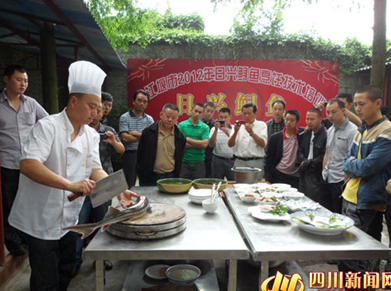 在都江堰市水务局的不断努力下,都江堰市日兴公司推出的鲟鱼,作为冷水鱼新一代宠儿被推上了餐桌,走进了千家万户,得到了旅客的认可。鲟鱼被称作“活化石”,是淡水中最大的水生动物,其肉和卵均为高档营养食品,具有极高的食用价值。尤其是用鲟鱼卵加工的鱼仔酱,国际市场供不应求,价格昂贵,享有“黑色黄金”的美誉。丰富都江堰市冷水鱼产品种类,促进冷水鱼产业的发展,提升以冷水鱼为主题的休闲式餐饮旅游业层次,2012年6月8日,由都江堰市水务局主办,都江堰市餐饮协会和都江堰市日兴鲟鱼科技有限公司协办的“2012日兴鲟鱼烹饪技术培训会”在李子园成功召开。本次培训会属都江堰市首次召开的鲟鱼烹饪培训会,培训主要内容包括鲟鱼宴的烹调技术与讲解,此次培训共吸引了来自全市50余家知名餐饮企业的负责人和名厨参加培训,参加培训的人员共计113人。