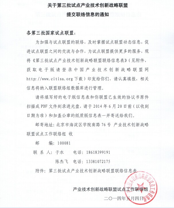 关于第三批试点产业技术创新战略联盟提交联络信息的通知