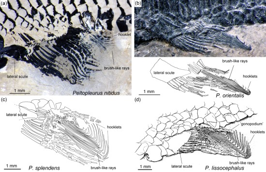 雄性肋鳞鱼臀鳍比较图,显示肋鳞鱼交配器的演化