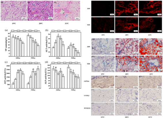 研究团队采用多学科交叉的研究方法,系统阐明了慢性热应激对达氏鳇肝脏损伤的作用机制。研究发现:热应激导致达氏鳇肝细胞结构异常,表现为细胞排列不规则、高度肿胀、边界模糊并伴有空泡化;肝功能指标(总蛋白、谷丙转氨酶、谷草转氨酶)发生显著改变,随着热胁迫时间的延长及温度的升高,呈现动态变化;热应激会加速诱发肝细胞内活性氧自由基和脂质的过渡积累;热胁迫下肝脏组织中"铁死亡"信号通路活跃度较高,表现为COX2蛋白表达上调、GPX4蛋白表达下调。