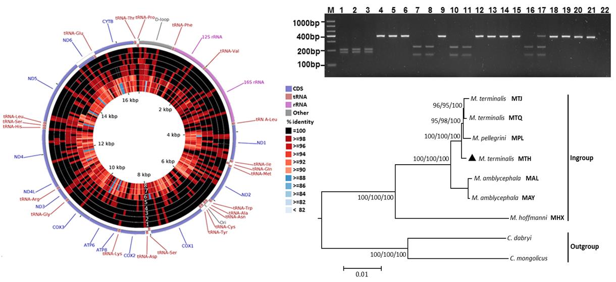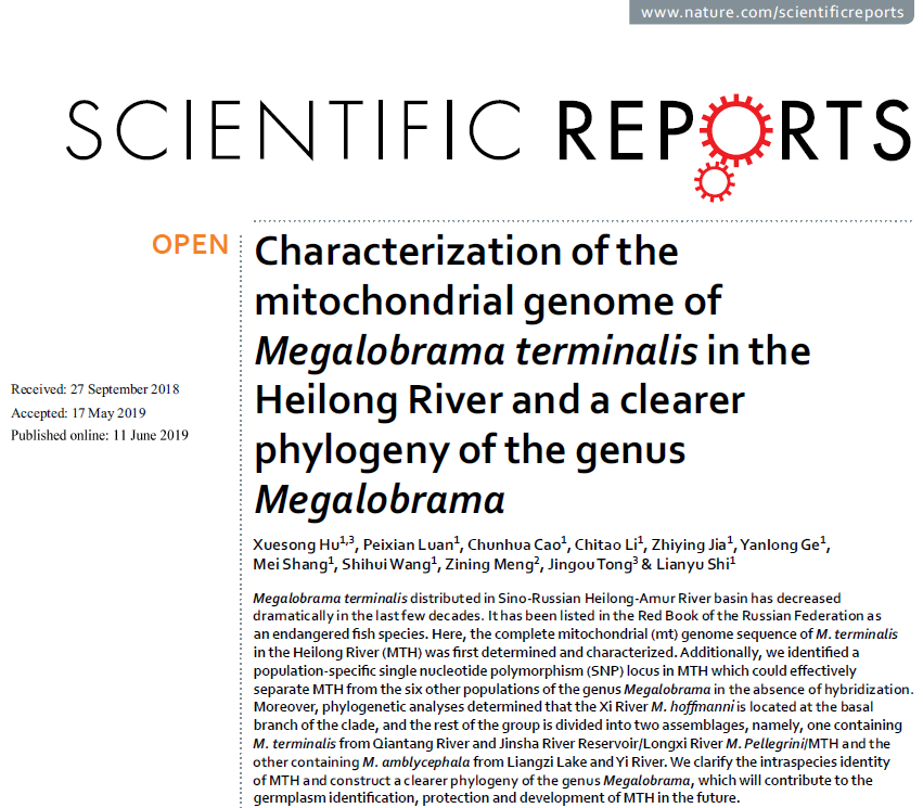 近日,国际开放获取期刊《Scientific Reports》(IF=4.011)刊发了以黑龙江水产研究所胡雪松博士为第一作者,黑龙江水产研究所石连玉研究员、中科院水生生物研究所童金苟研究员为共同通讯作者的科技论文:《Characterization of the mitochondrial genome ofMegalobrama terminalisin the Heilong River and a clearer phylogeny of the genusMegalobrama》。该研究通过比较法罗鱼黑龙江群体(M. terminalisin the Heilong River, MTH)与鲂属4个种6个南方群体的线粒体基因组序列差异,揭示了MTH的线粒体基因组特征;鉴定出1个MTH区别于南方鲂属鱼类的群体特异性标记。利用最大似然法、最大简约法及贝叶斯推断等方法构建了具有同一拓扑结构和极高置信度的系统树,厘清了MTH和南方鲂属鱼类的亲缘关系。通过引入MTH,提供了一个更清晰的鲂属鱼类系统发生关系。