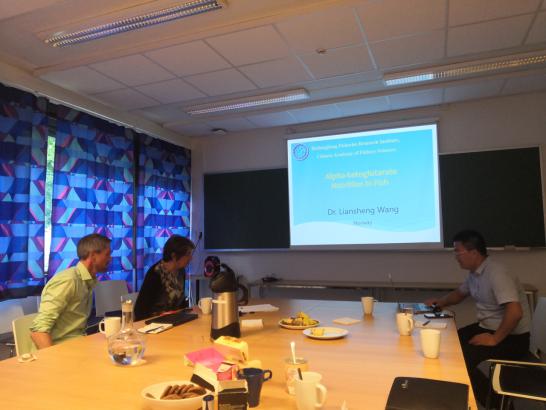 挪威海洋研究所科研主管Erik-Jan Lock教授和Nini Sissener博士简要介绍了挪威海洋研究所和该所鱼类营养研究室的发展概况和研究成果。鱼类营养研究室Kristin Hamre教授、Nina Liland博士和Sofie Rem?博士分别作了主题为《鱼类氧化还原生理平衡的研究进展》《昆虫蛋白在三文鱼饲料中的应用》和《三文鱼日粮中组氨酸含量对控制白内障风险的作用》的专题报告。随后,?ivind Strand教授还简要介绍了挪威海洋研究所与中国水产科学研究院在海洋底栖资源方面的国际合作情况。
