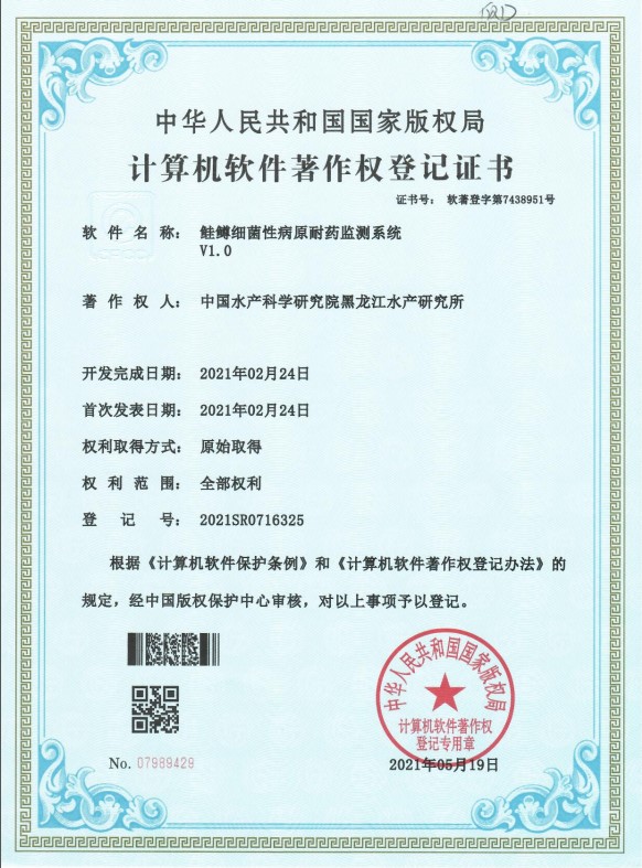 由冷水性鱼类病害防控科技创新团队王荻等人申请的“鲑鳟细菌性病原耐药监测系统V1.0”获国家计算机软件著作权,登记号为2021SR0716325。