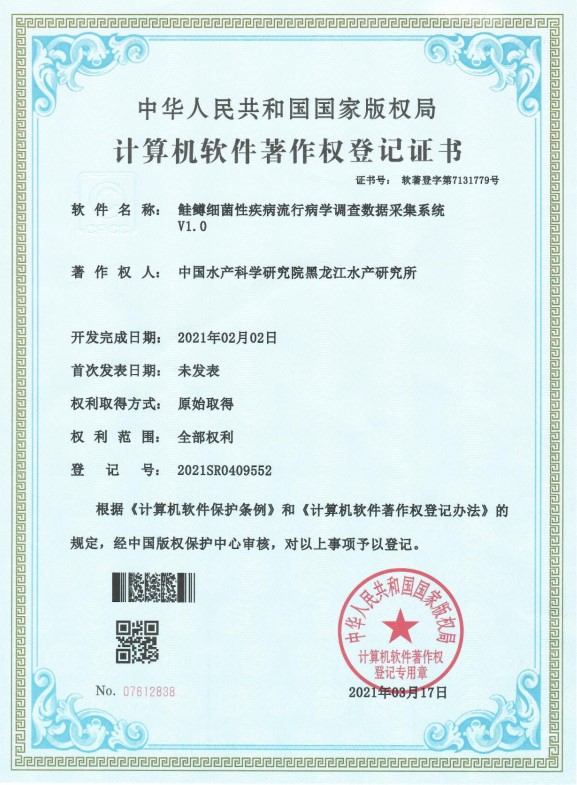 由冷水性鱼类病害防治科技创新团队王荻等人申请的“鲑鳟细菌性疾病流行病学调查数据采集系统V1.0”获国家计算机软件著作权,登记号为2021SR0409552。