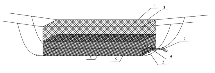 本实用新型研发的鱼类苗种池塘养殖的网箱,网箱呈长方形,长10m、宽3m、高度为2m。由上层大网衣、下层小网衣、钢丝绳框架、出鱼口、聚乙烯固定绳、网底和网袋组成,上层大网衣上端的四个边固定在钢丝绳框架上,上层大网衣的下端与下层小网衣的上端连接,在下层小网衣的侧面设有出鱼口,网底的四个角设有聚乙烯固定绳,网袋的网口设在出鱼口上。上层大网目网衣(0.6cm)和下层小网目网衣(40目)的高度各为1米,仔鱼期用下层小网目网衣养殖,鱼种期用上层大网目网衣养殖。在不更换、不清洗网箱的情况下,在池塘可连续完成仔鱼和鱼种的养殖。