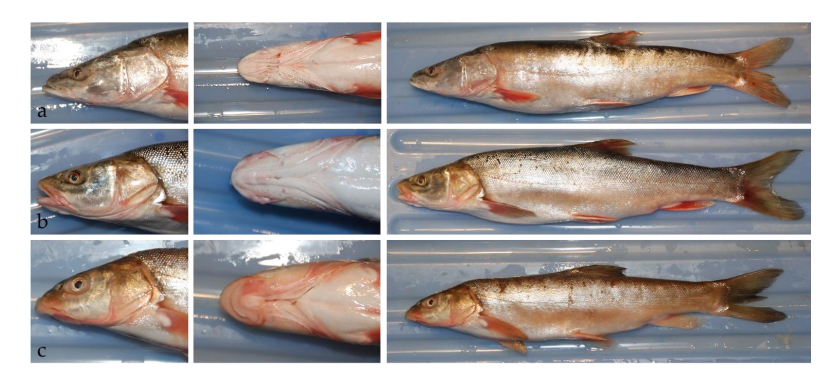 a:Aspiorhynchus laticeps;b:Schizothorax esocinus;c:Schizothorax biddulphi