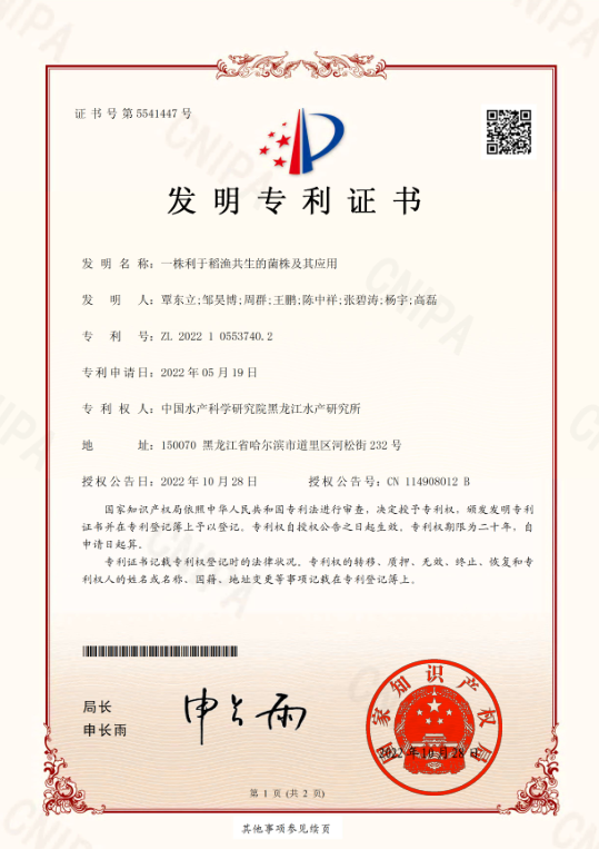 由覃东立等人完成的“一株利于稻渔共生的菌株及其应用”获国家发明专利授权,授权专利号:ZL202210553740.2。