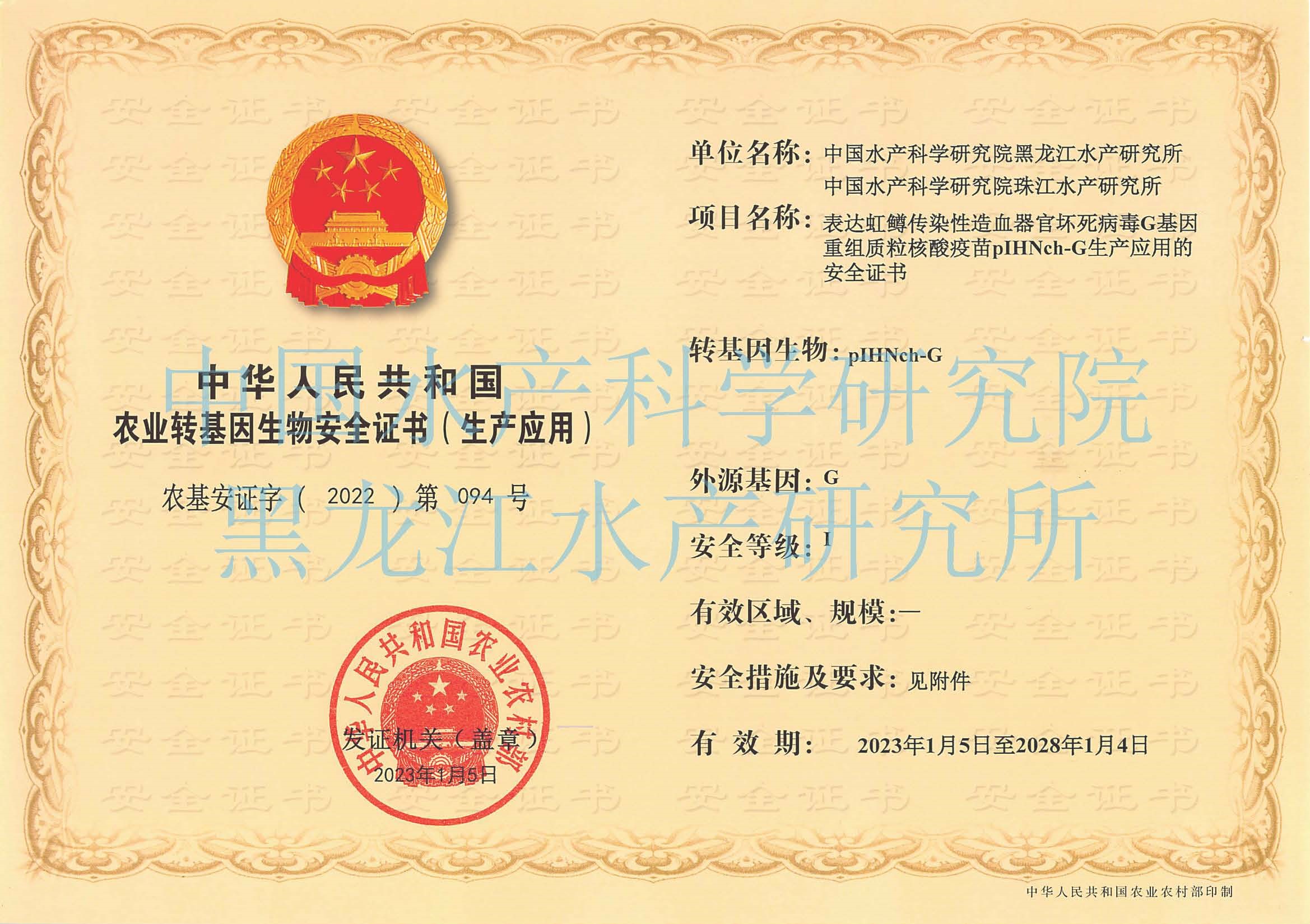 传染性造血器官坏死?。?span style="font-family: "times new roman";">Infectious Hematopoietic Necrosis,IHN)是多年来造成我国虹鳟养殖业重大损失的主要疾病,严重影响产业的可持续发展。为解决这一制约产业发展的关键问题,冷水性鱼类病害防控创新团队潜心研究10余年,研制出实验室?;ぢ矢叽?span style="font-family: "times new roman";">90%以上、田间相对?;ぢ矢叽?span style="font-family: "times new roman";">88%以上的、具有自主知识产权的虹鳟IHN核酸疫苗,并于2019-2022年间顺利完成农业转基因生物安全评价的中间试验、环境释放实验和生产性实验,近日获批“表达虹鳟传染性造血器官坏死病毒G基因重组质粒核酸疫苗pIHNch-G生产应用的安全证书”(农基安证字(2022)第094号),该疫苗是我国首个获批转基因生物安全证书的水产核酸疫苗,填补了领域空白。