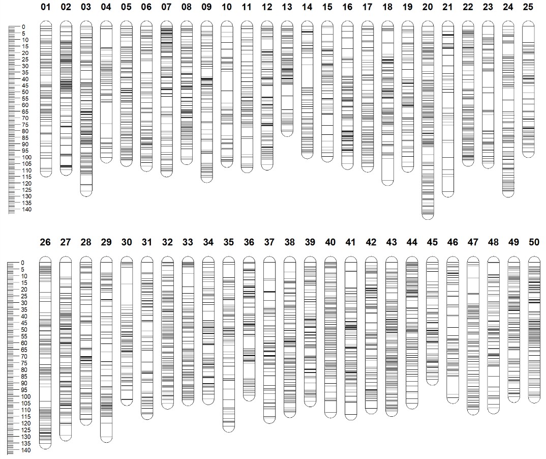 利用11,445个高质量SNP标记构建了一个包含50个连锁群的高密度遗传连锁图谱,围绕第一个越冬期,共鉴定出15个对越冬前后体重有显著影响的QTLs,鉴定到2个主效QTL,还发现多个位点在2个时间点影响体重之外的其他4个性状,包括体长(6个位点)、体高(7个位点)、体厚(3个位点)和头长(5个位点)。此外,在QTL区间还鉴定了9个候选基因,有5个基因直接与生长激素相关,其中3个基因来自2个主效QTLs。该研究鉴定的第一个越冬期前后的生长相关的QTLs及候选基因,可对东北或其他高纬地区鲤生长性状的早期选择提供参考。