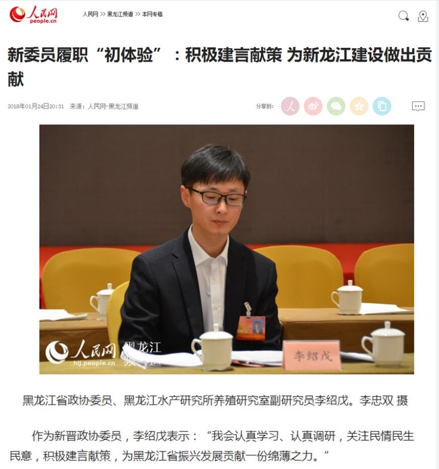 经黑龙江省直属机关工委推荐和省政协资格审查委员会审查,中国水产科学研究院黑龙江水产研究所养殖研究室副主任李绍戊同志当选中国人民政治协商会议黑龙江省第十二届委员会委员。