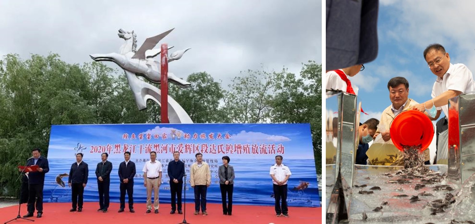 为了?;ず诹赜杏憷?-达氏鳇种群资源,开展栖息地生态修复和养护。8月18日,由黑龙江省农业农村厅联合中国水产科学研究院黑龙江水产研究所、黑龙江省水生动物资源养护中心和黑河市爱辉区人民政府在黑河市爱辉区共同开展“2020年黑龙江干流黑河市爱辉区段达氏鳇增殖放流”活动。黑龙江省农业农村厅副厅长孙文志、黑龙江水产研究所所长金星、黑河市委书记马里、爱辉区区委书记张建国,以及省渔业渔政局、黑龙江水产研究所、省水生生物救护中心和黑河市政府相关部门工作人员70余人参加此次放流活动。