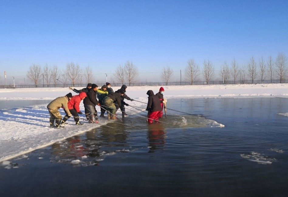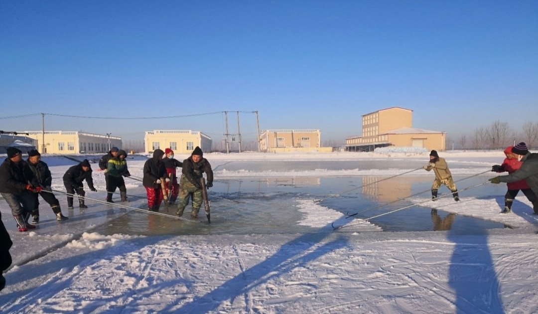 冰凉的北风,吹不散的是水产人对自己事业的热情;恶劣的环境,吓不倒的是水产人齐心协力保安全的意志。经过6天的连续奋战,至28日下午,共重塑冰面2万平方米,切割冰面平均厚度15cm以上,保证了越冬鱼类安然无恙。