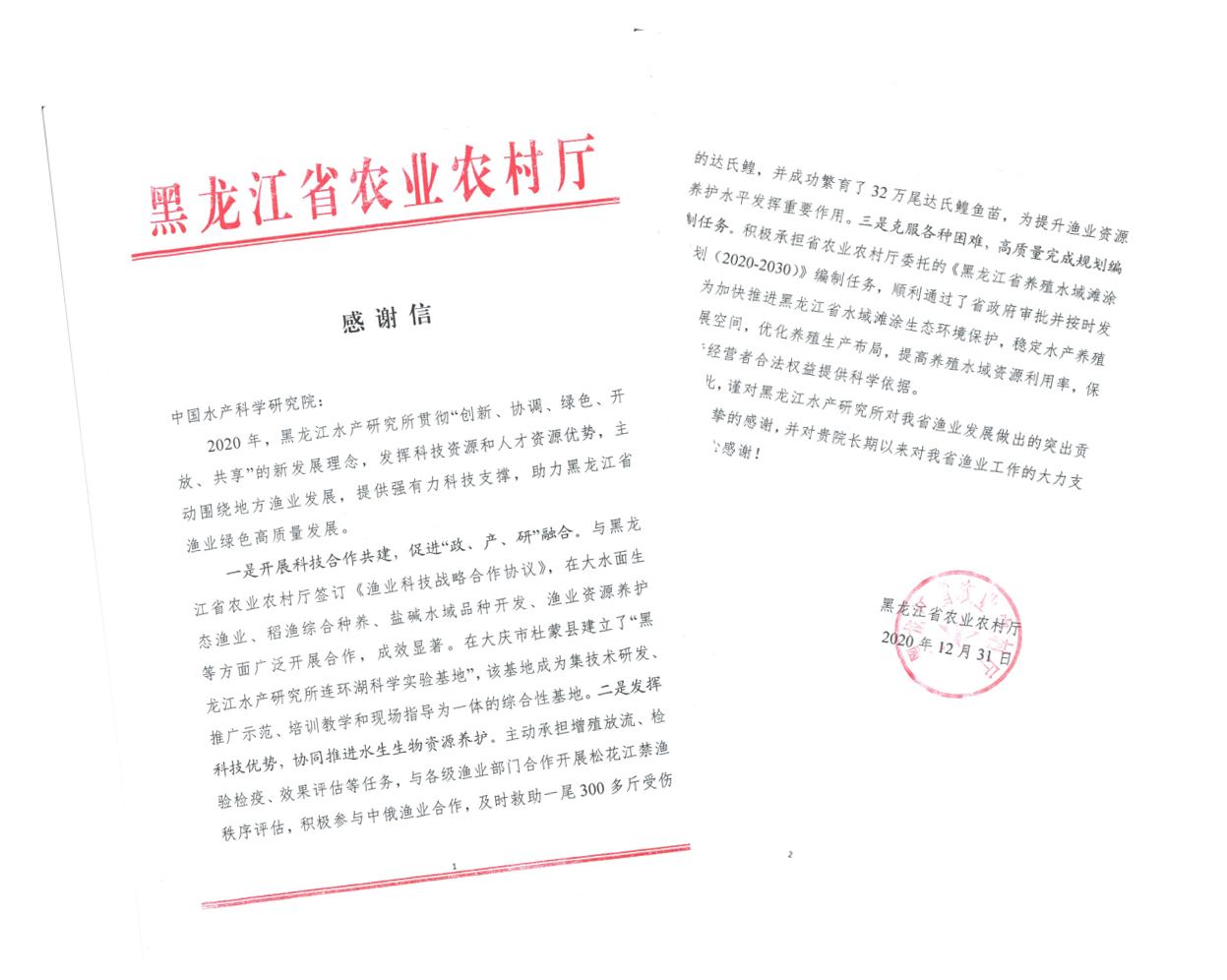 近日,黑龙江省农业农村厅向中国水产科学研究院黑龙江水产研究发来感谢信,对2020年黑龙江所落实《渔业科技战略合作协议》,发挥科技资源和人才资源优势,为黑龙江省渔业发展做出的突出贡献给予肯定和感谢。