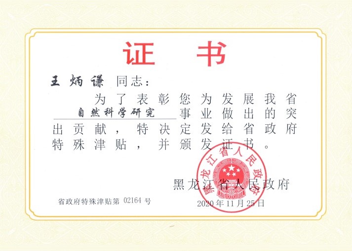 王炳谦研究员获黑龙江省政府特殊津贴。