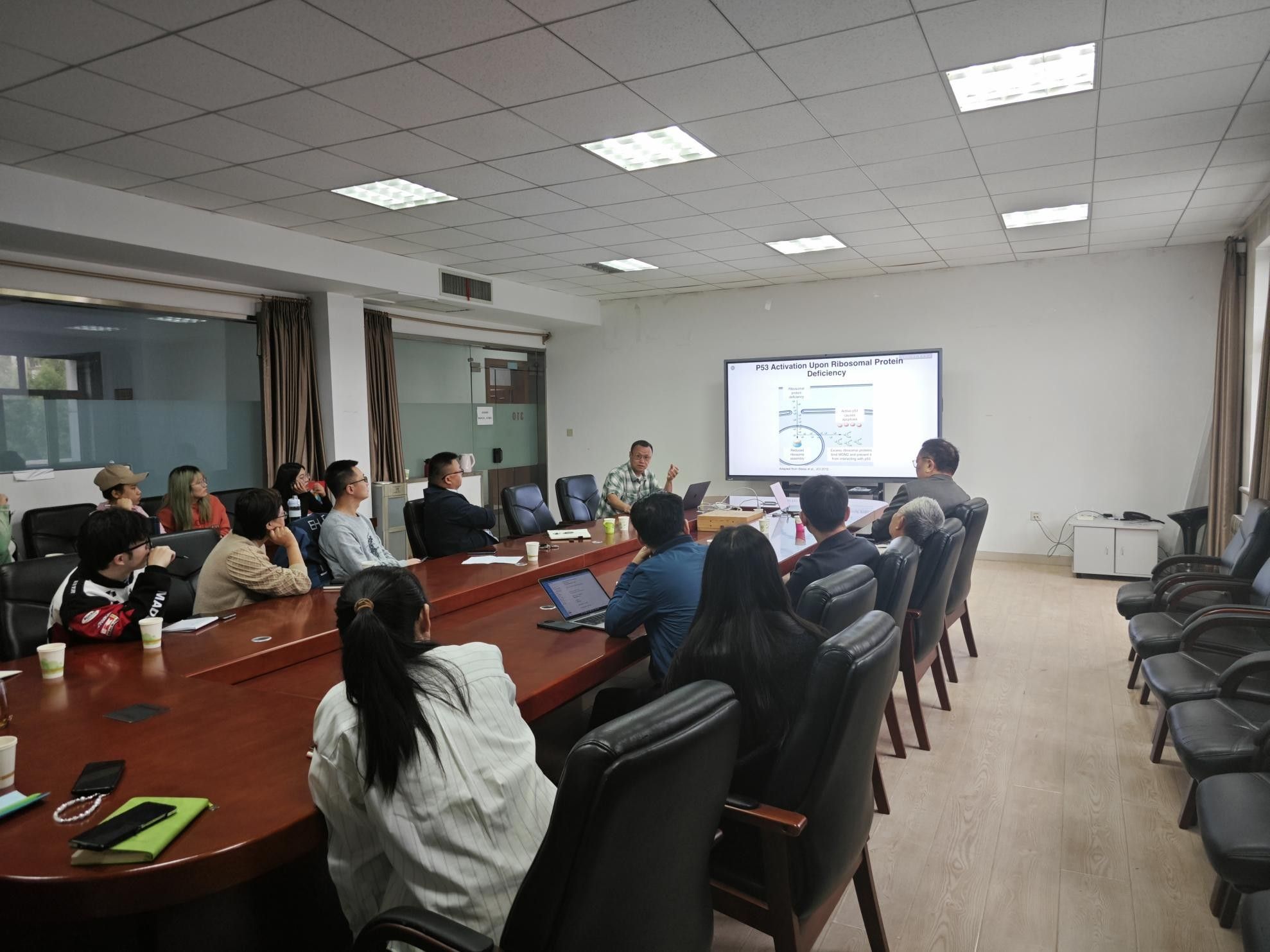 周一博士作题为“Modeling Diamond-Blackfan Anemia for Drug Development”的报告,详细介绍了使用斑马鱼构建先天性纯红细胞再生障碍性贫血疾病模型并进行药物筛选的系列研究成果。隋广超教授作题为“G-四链体促进转录因子MAZ相分离凝聚体的分子动态性”的报告,对启动子中G-四链体通过增强MAZ蛋白相分离凝聚体的动态性以激活CCND1表达的机制研究进行了系统的介绍。与会的科研人员就核糖体蛋白家族的功能、G-四链体的特异性、谱系追踪方法和G-四链体研究在肌间刺发育的机制解析、转录调控研究中的应用等问题进行了深入的讨论和交流。
