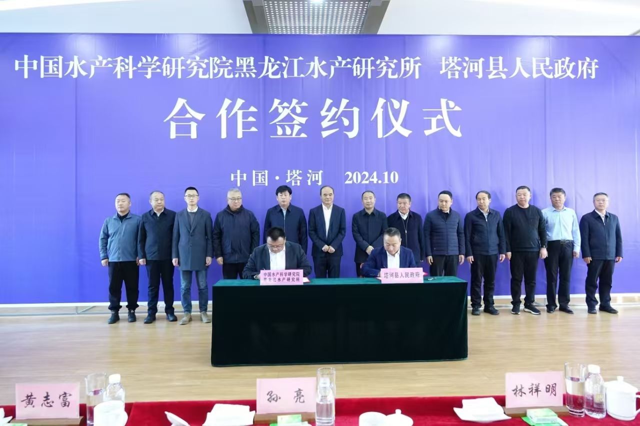10月17日,黑龙江所与大兴安岭地区塔河县人民政府举行合作签约仪式,共同建设我国最北冷水鱼试验基地—“塔河基地”。中国水产科学研究院副院长林祥明、黑龙江水产研究所所长郑先虎、大兴安岭地委委员孙亮(塔河县委书记)等出席仪式并致辞。大兴安岭地区行署副专员黄志富、省农业农村厅总兽医师邰伟,以及塔河县县长宋波、县人大主任李振峰、县政协主席冯宝利等领导参加签约仪式。